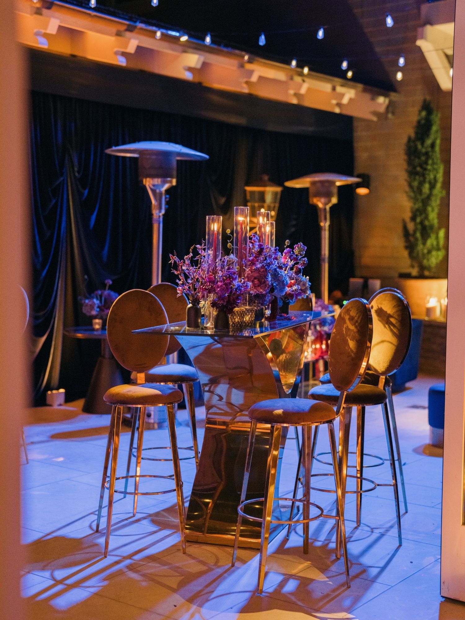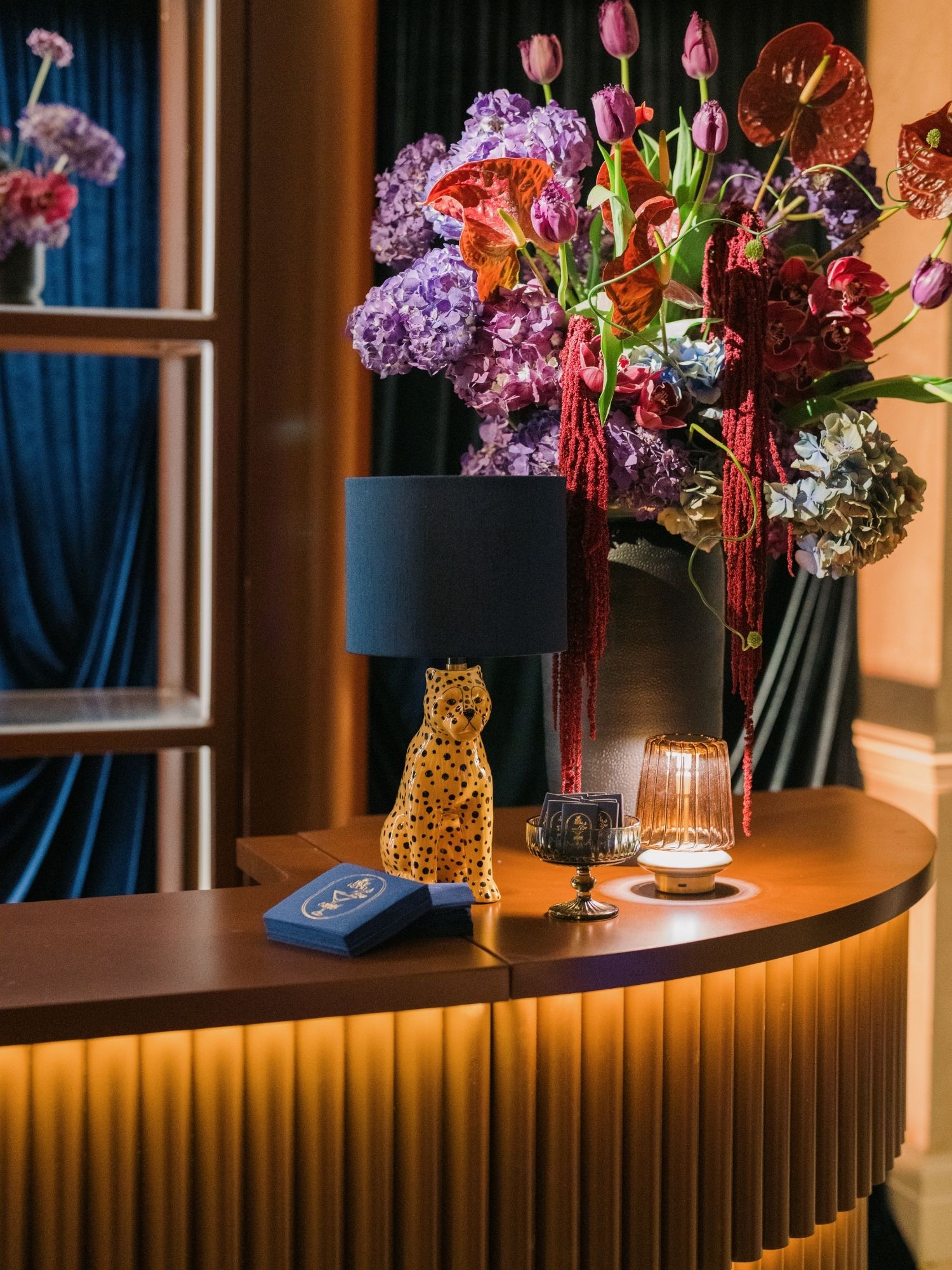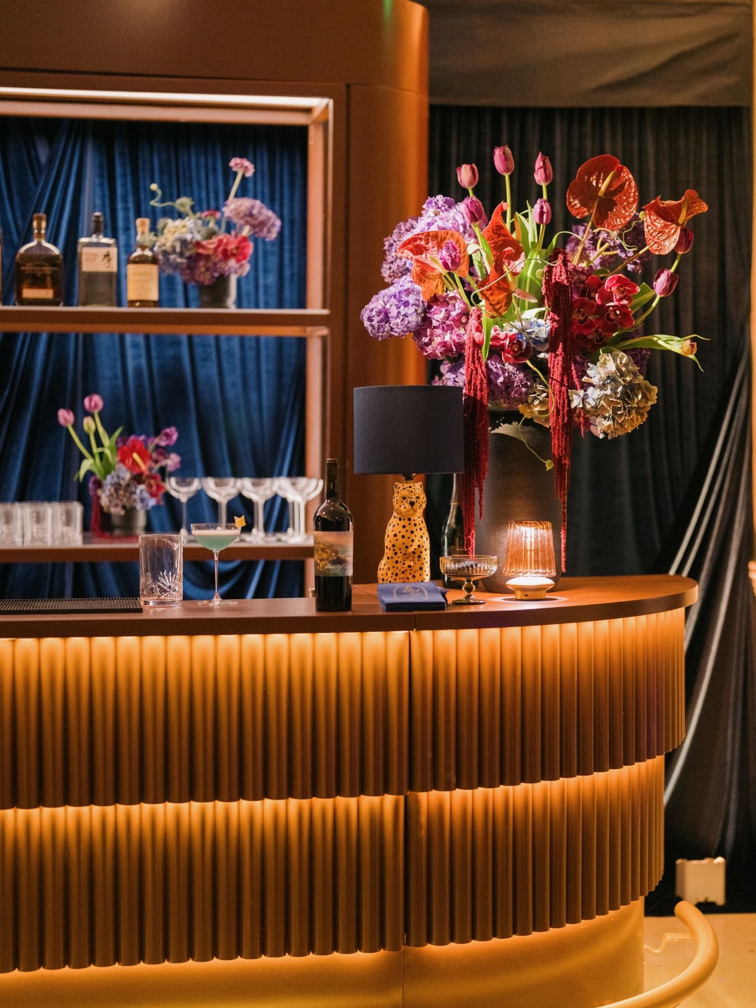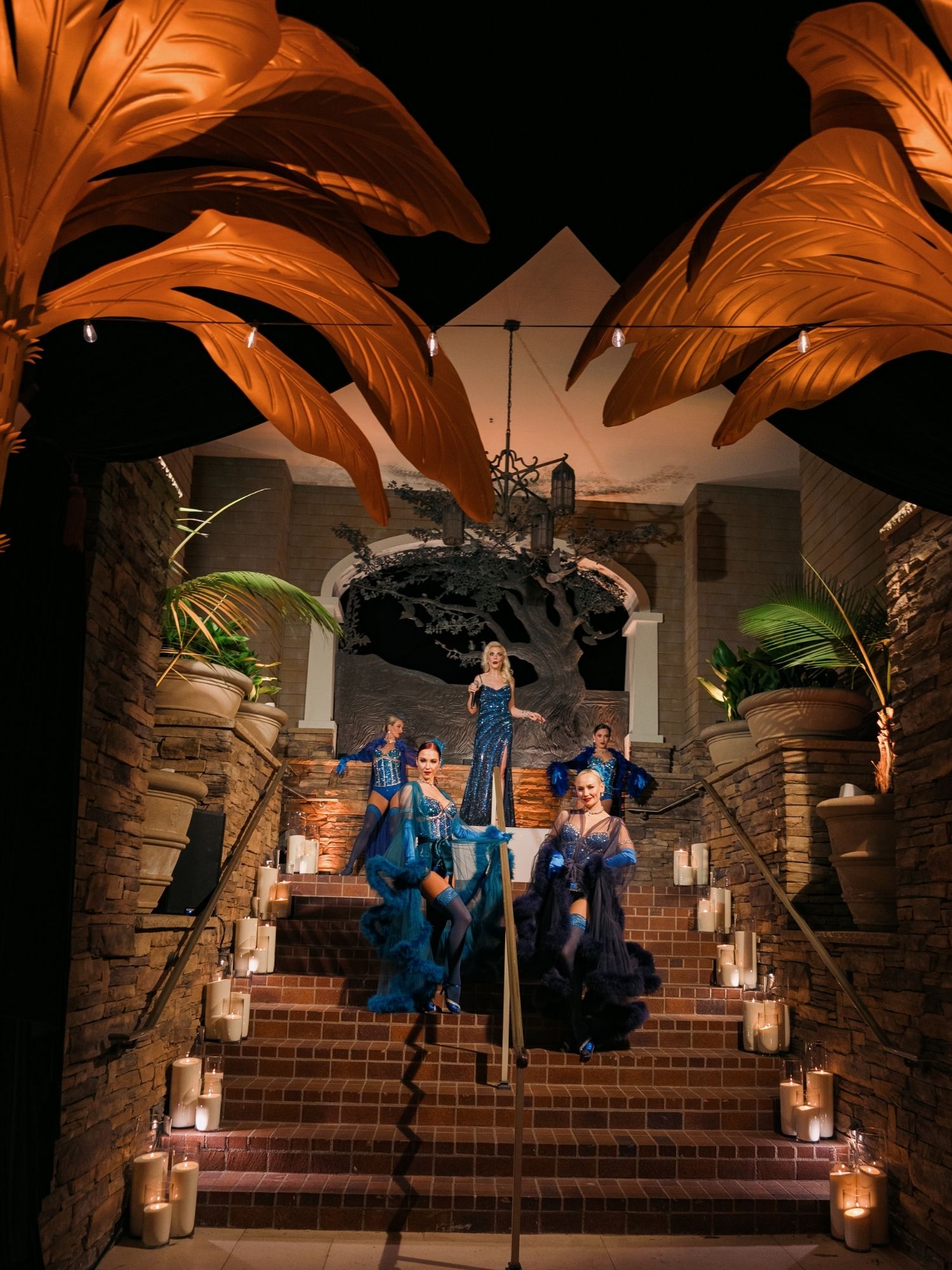 To create a memorable sense of arrival, we chose oversized palm trees to frame the entrance — proving that sometimes a bold, scaled element is exactly what a space needs to feel complete. The combination of staging, props, and live performance elevated the environment. If you take a close look the bar also includes the Ceramic Cheetah table lamp, an unexpected touch that became a guest favorite, sparking conversation and photo moments alike.