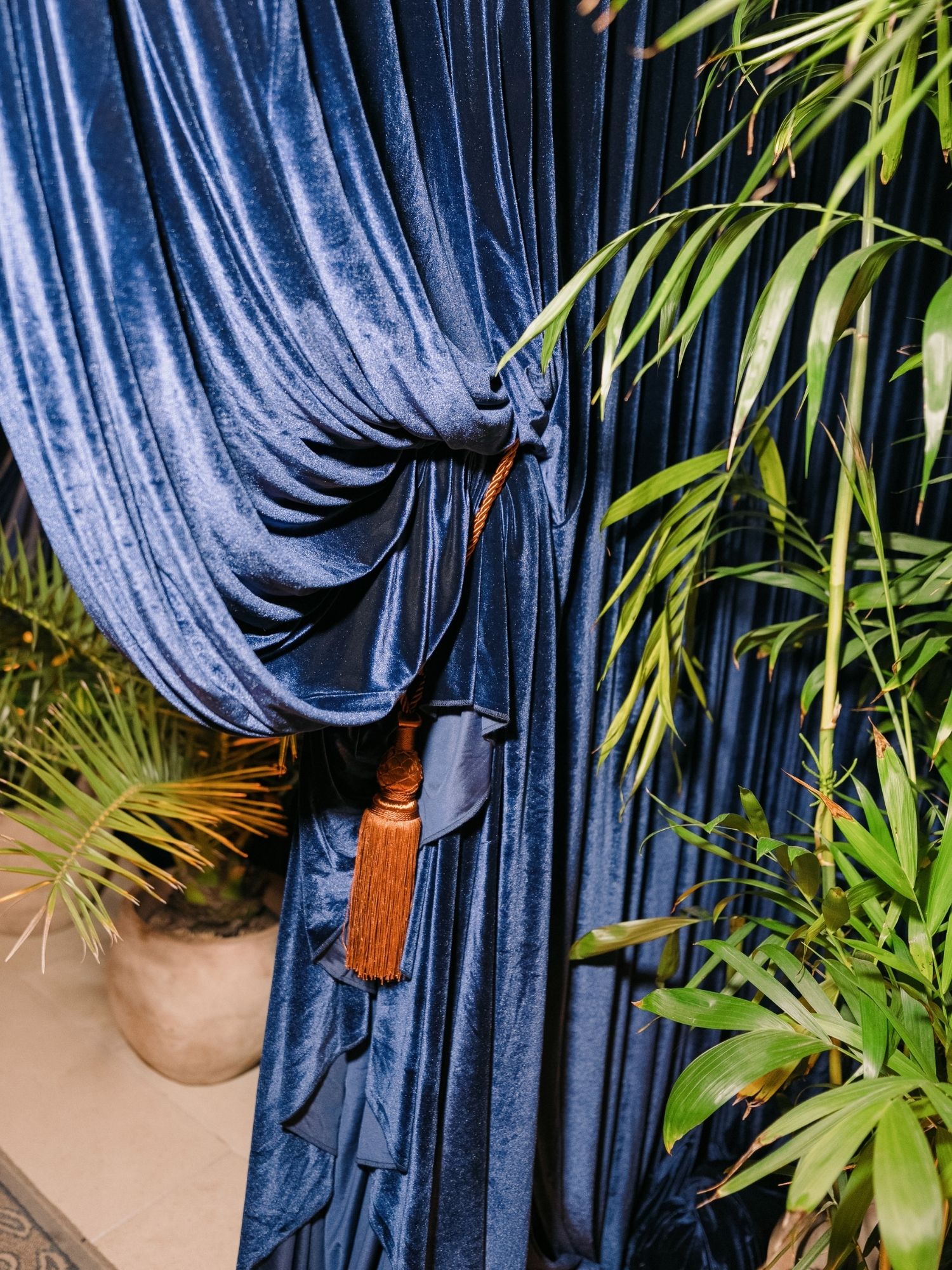 Draping transformed the Blue Room into a fully immersive space. Over 250 feet of navy stretch velvet introduced depth and fluidity, instantly shifting the mood of the space. We added Gold tassels and fringe for texture, while tailored valances kept the look polished. At the entrance, layered swags and soft billows created a welcoming transition—setting the tone from the moment guests arrived.
