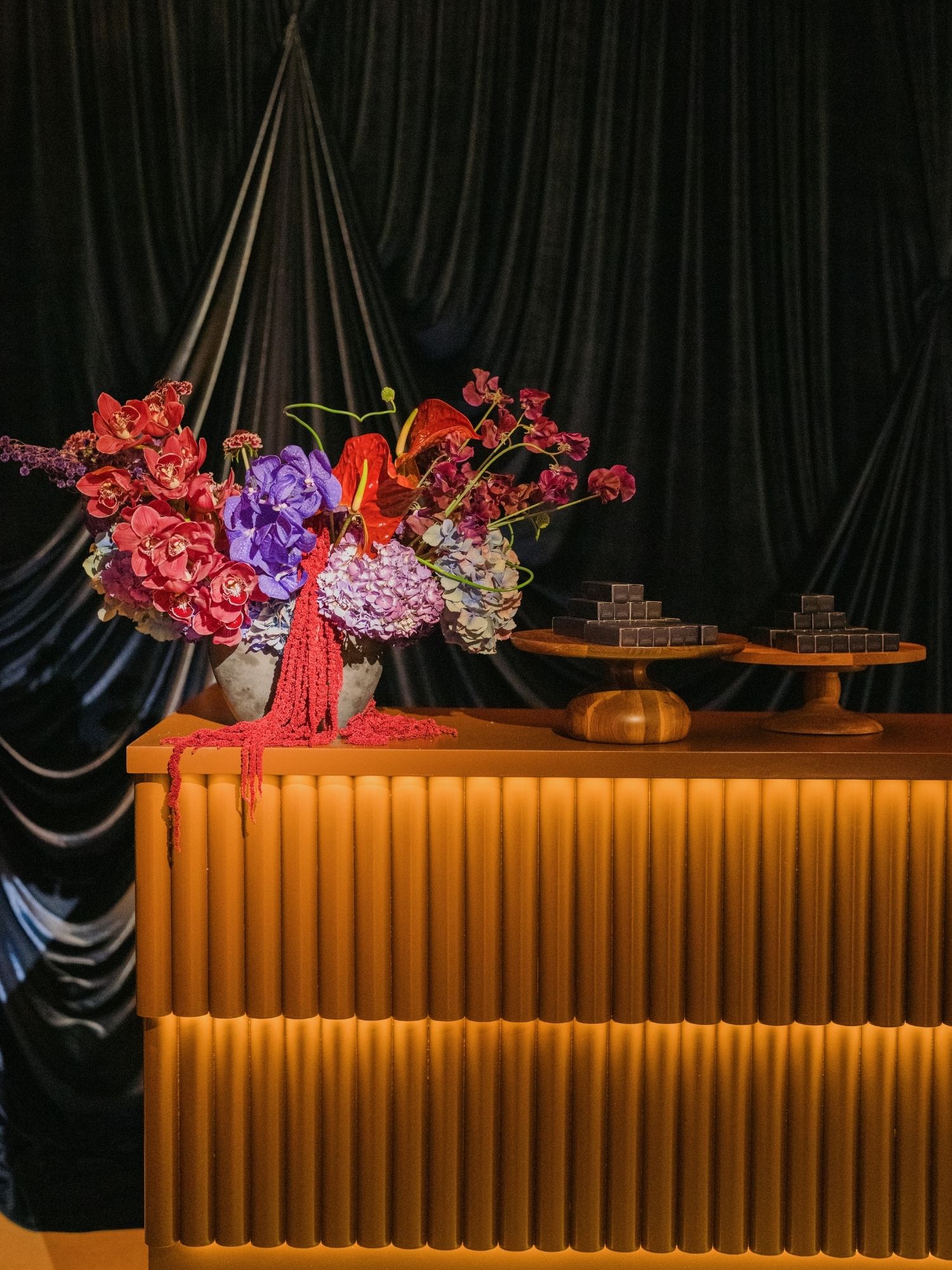 Our tiered slats bar, finished in a rich Brown tone, introduced warmth and contrast against the cooler blue hues. There were two different bar sections. One featured our custom light-up barback, adding a soft glow. Both bar elements were designed with multicolor adaptability, allowing them to seamlessly align with the event’s overall aesthetic.