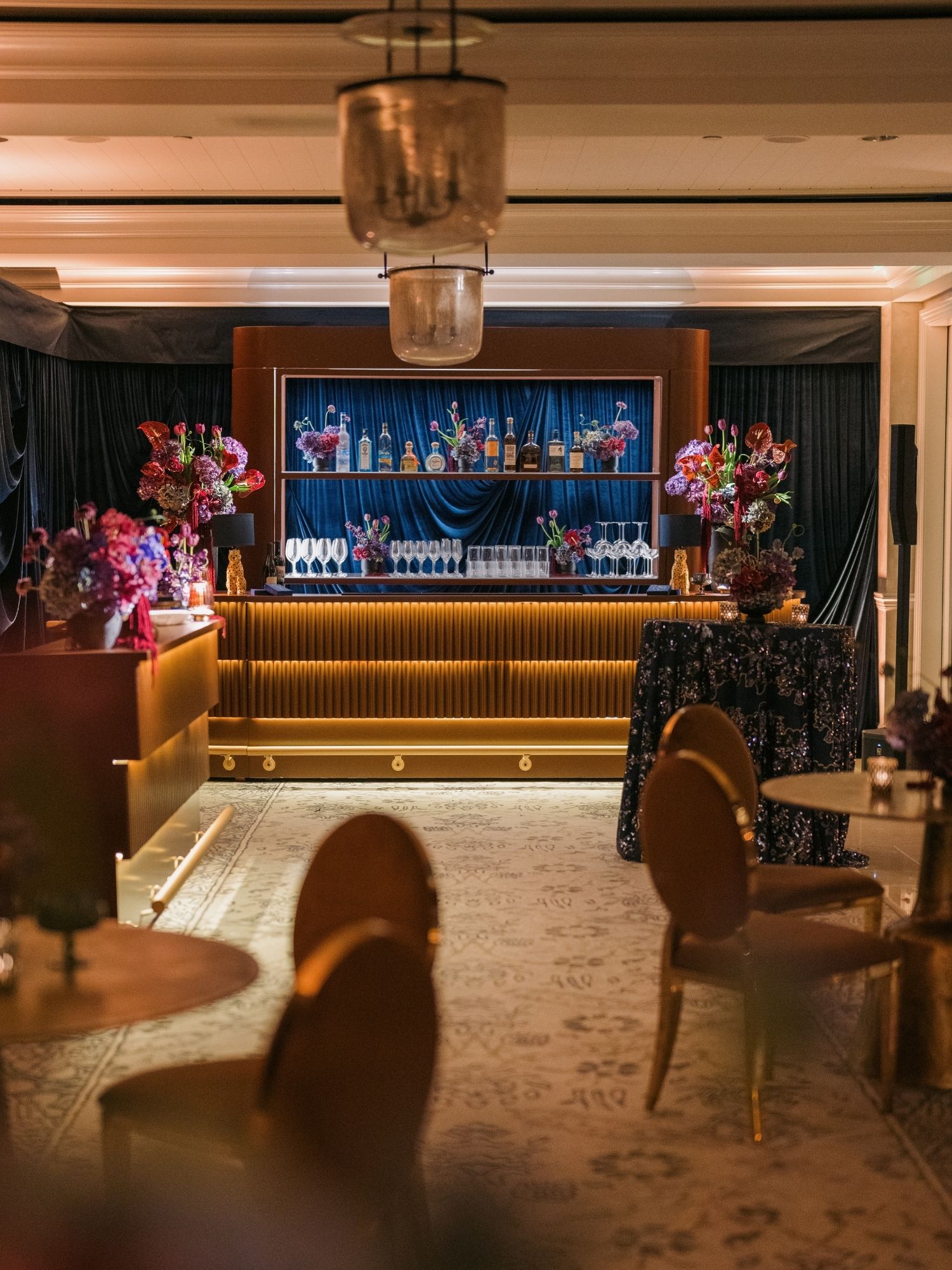 Inspired by a coastal cabaret aesthetic, this event—planned by RMC—layered rich textures and refined details throughout the Blue Room, creating an atmosphere that felt both intimate and dynamic.