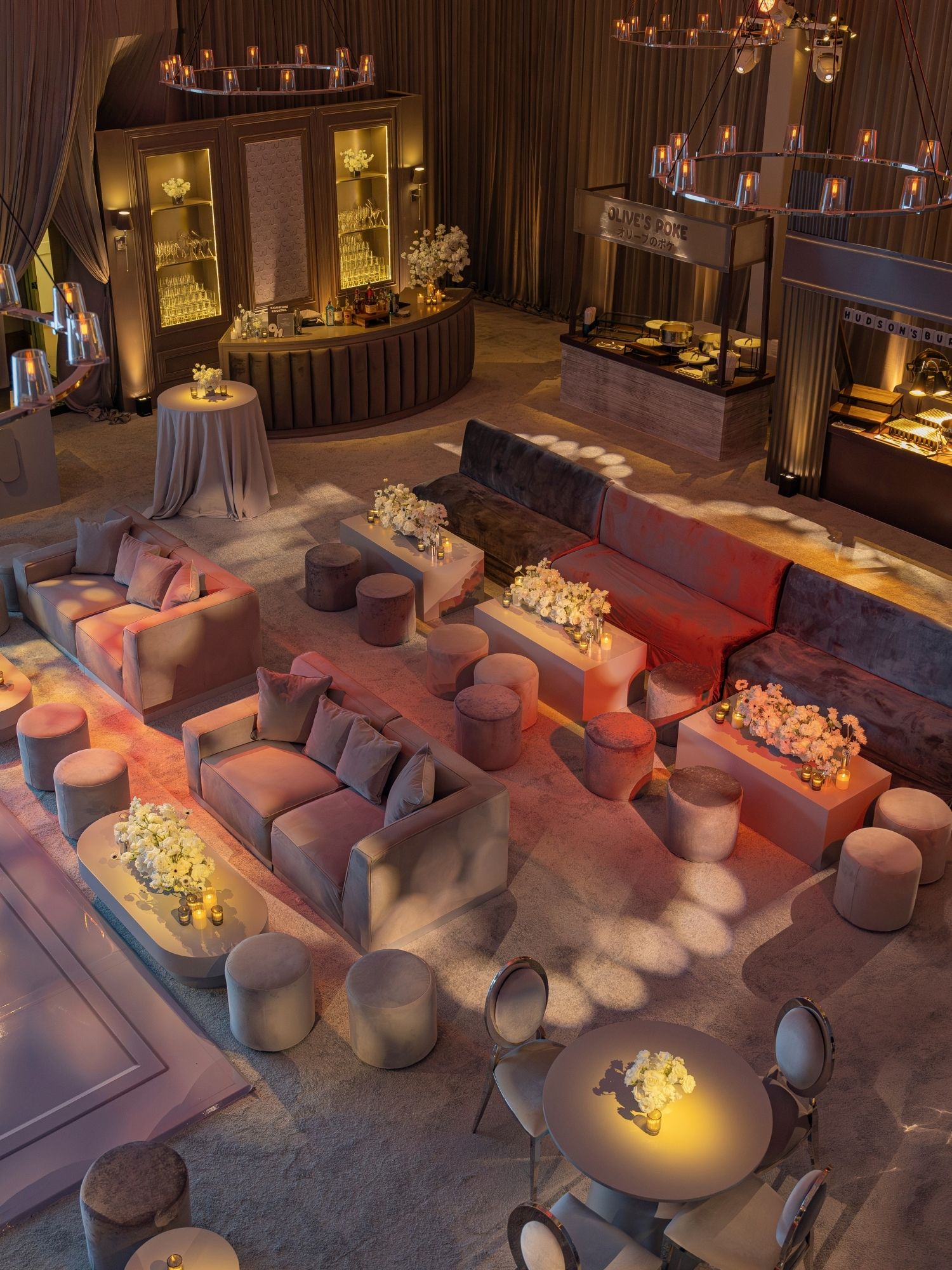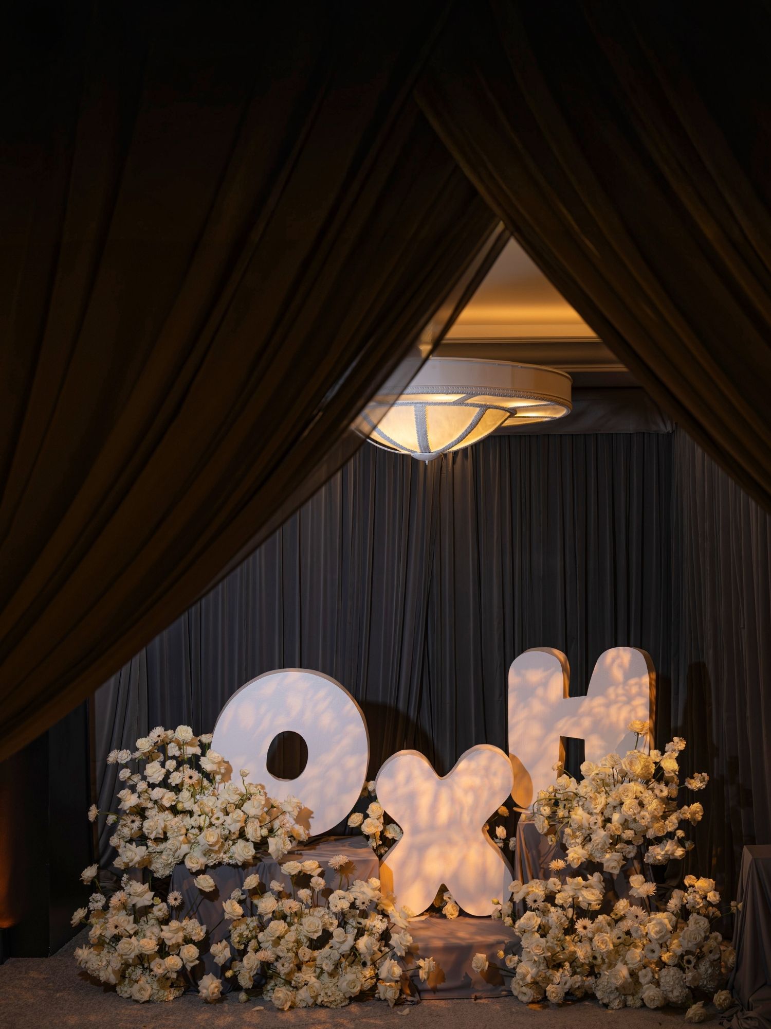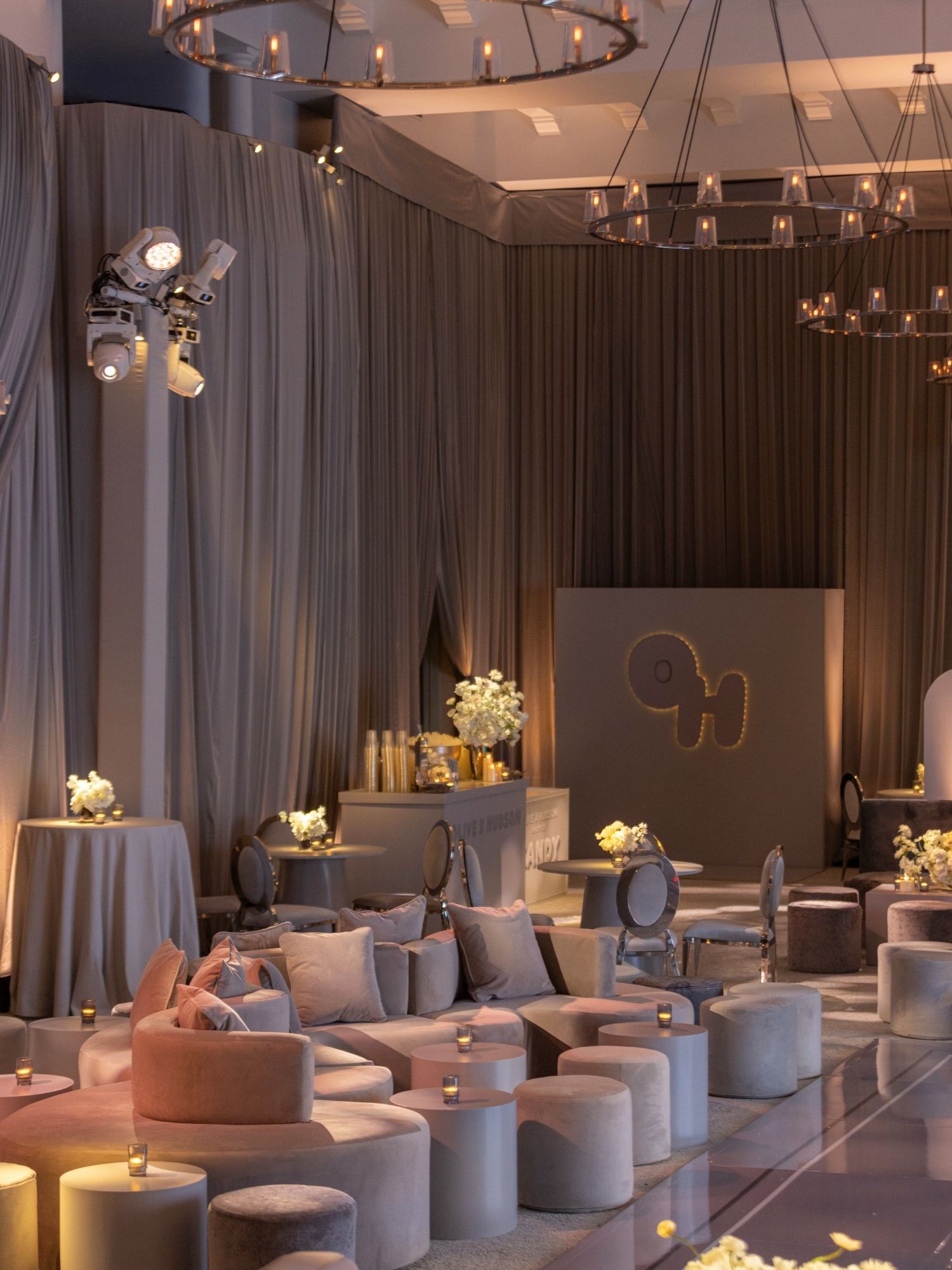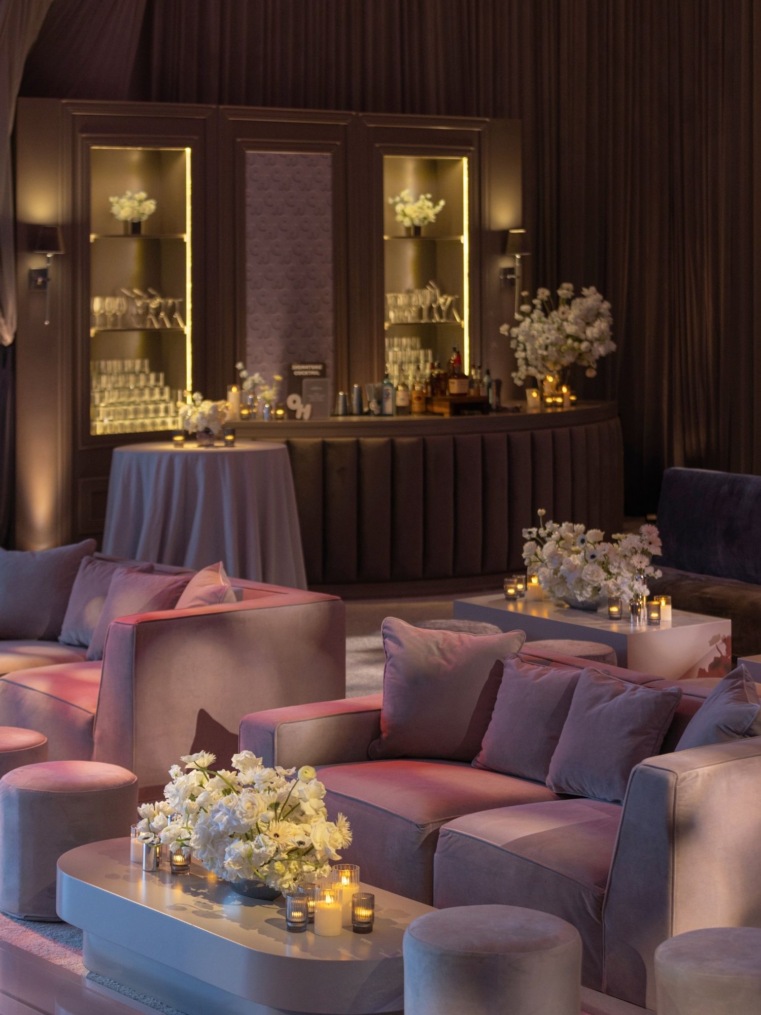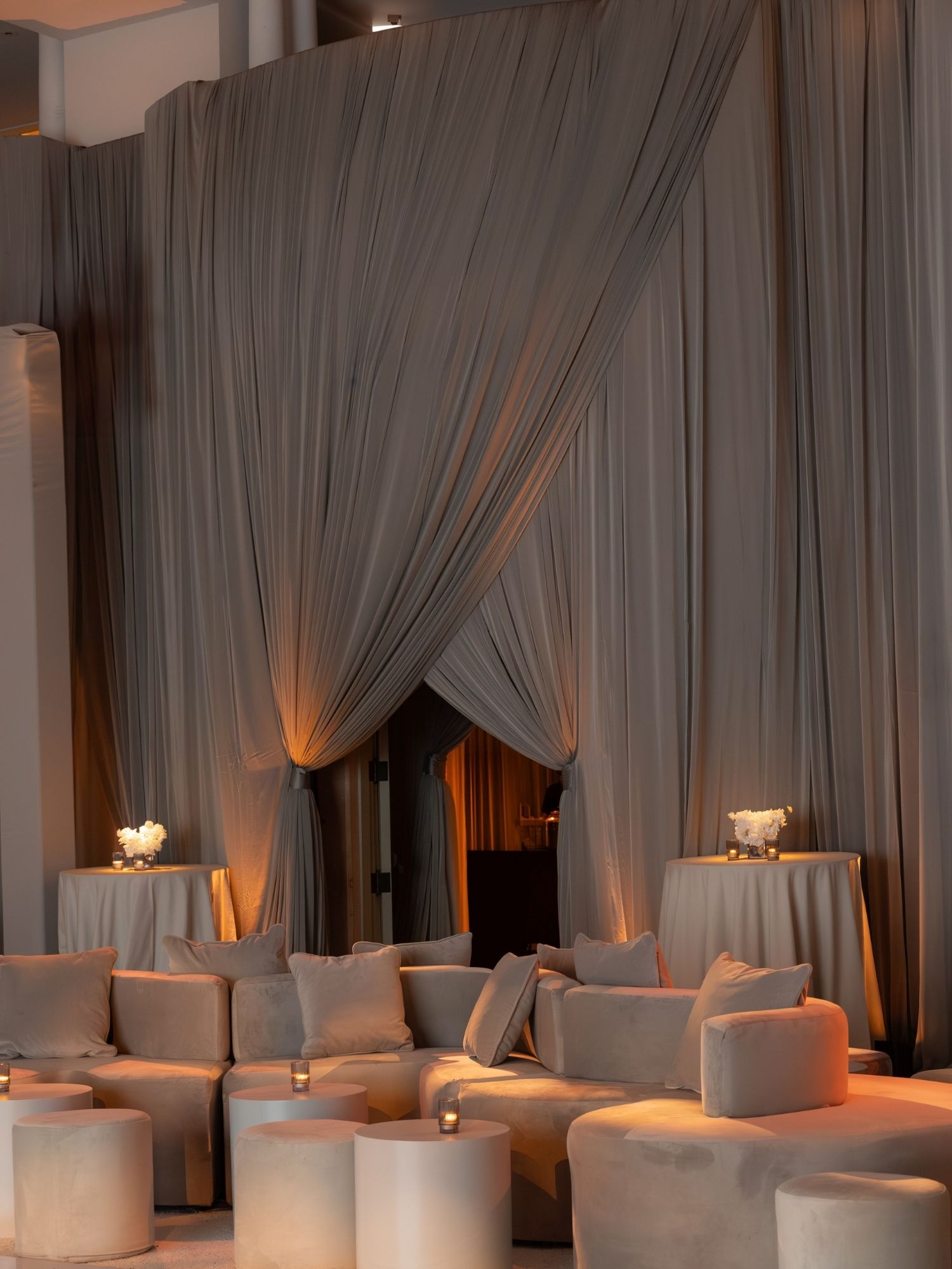 Upon entrance, guests walked through flowing draping paired with dim, ambient lighting. This created a dramatic and elegant first impression, setting the tone for the entire event.