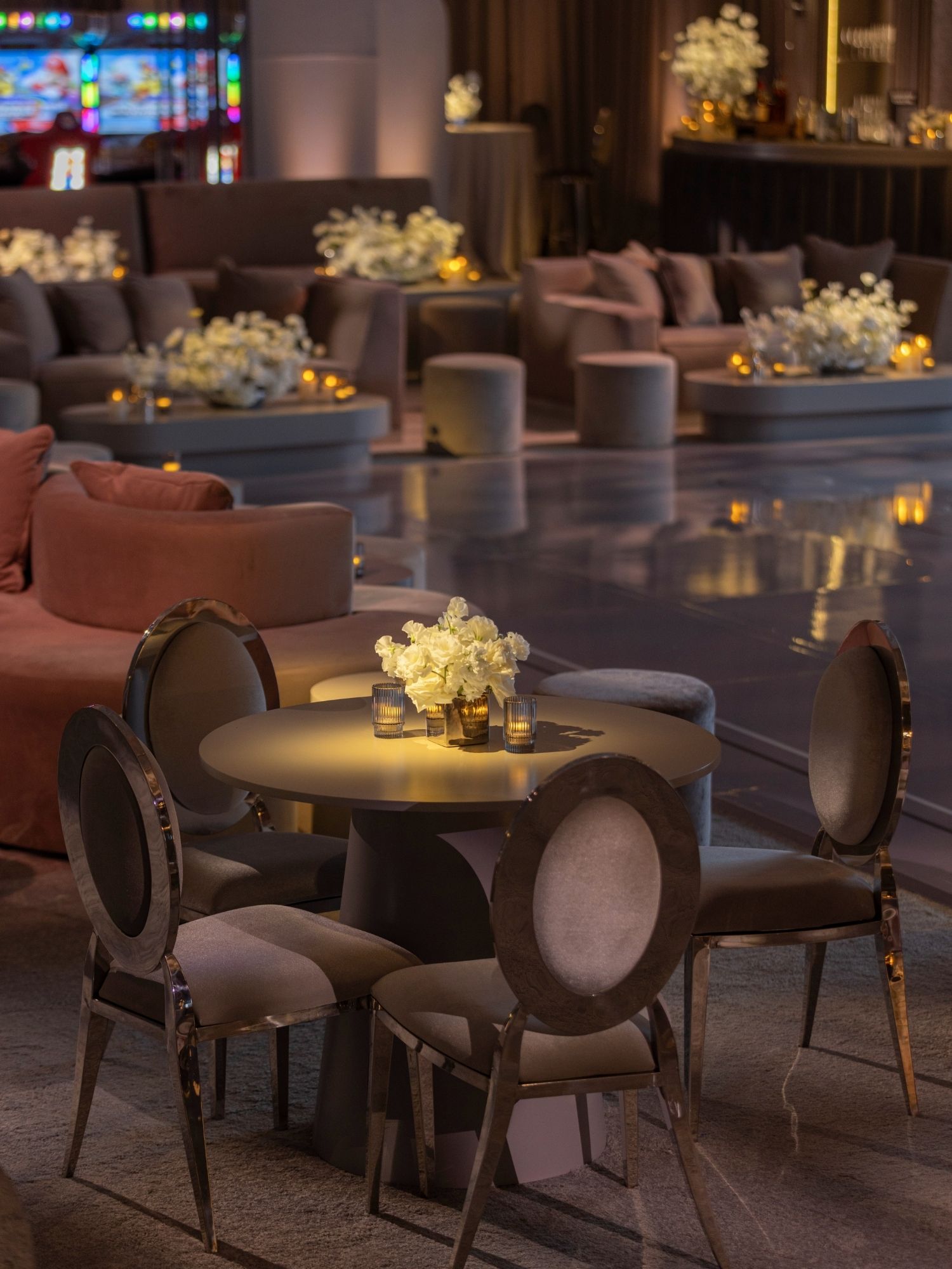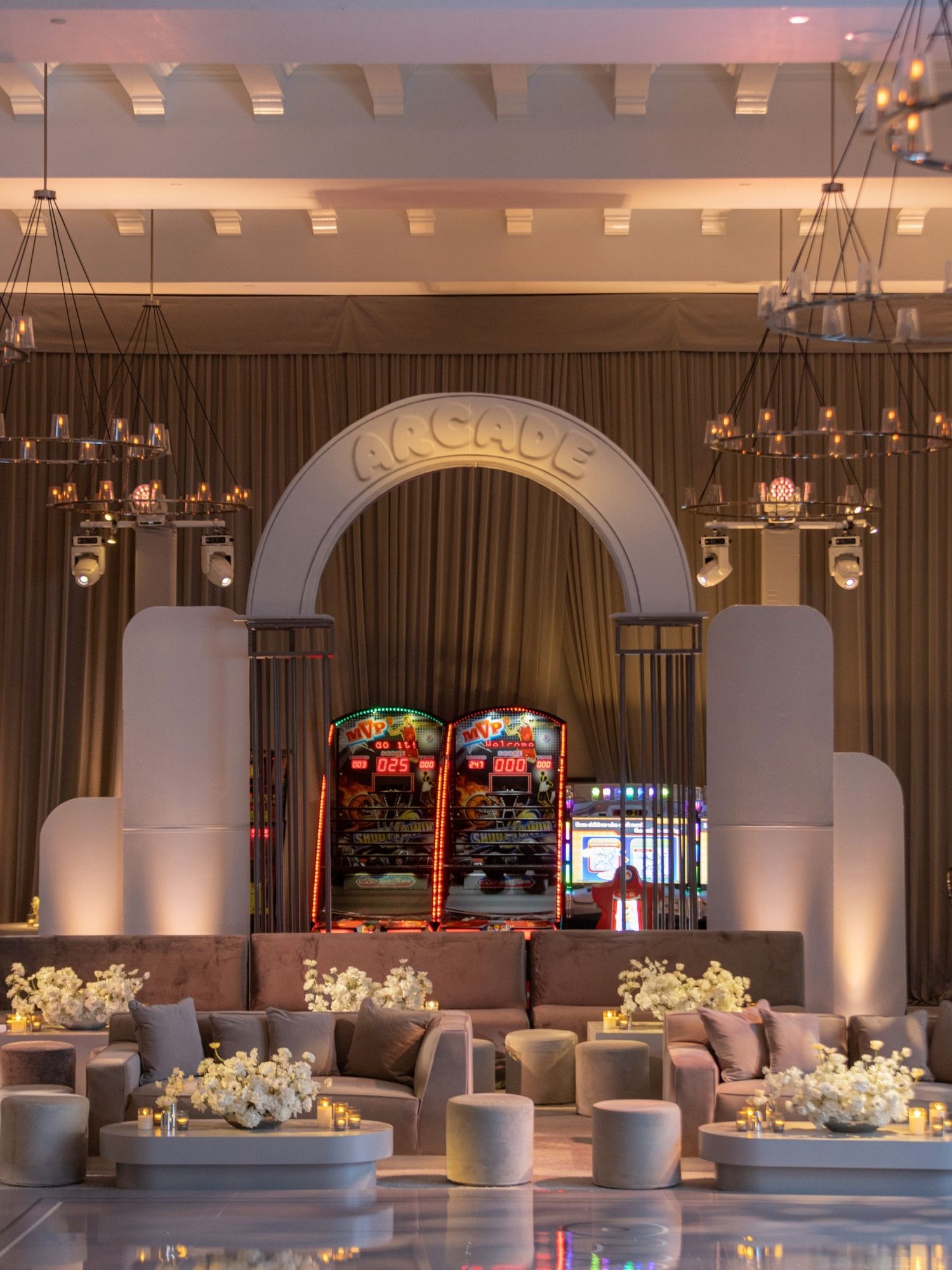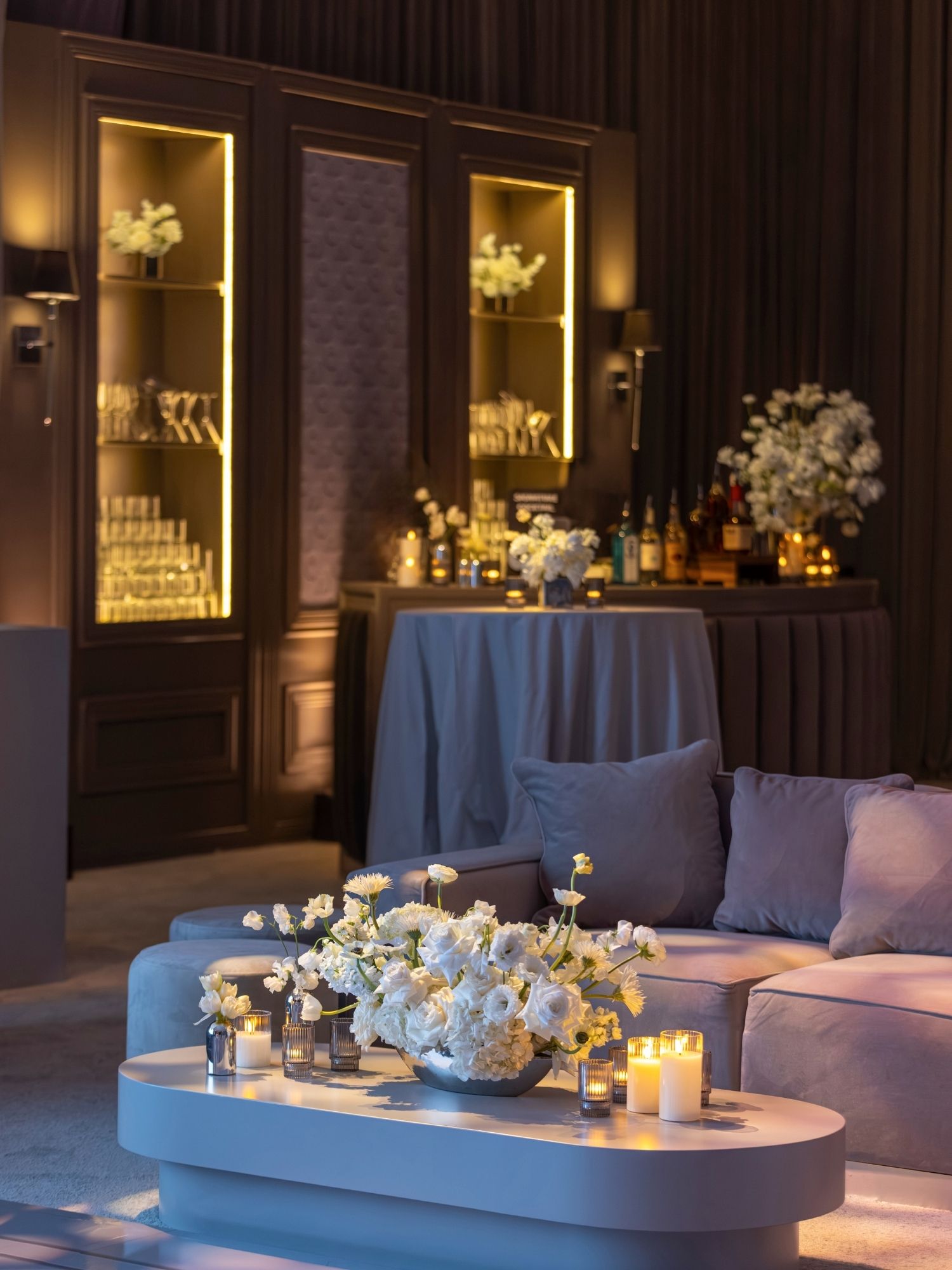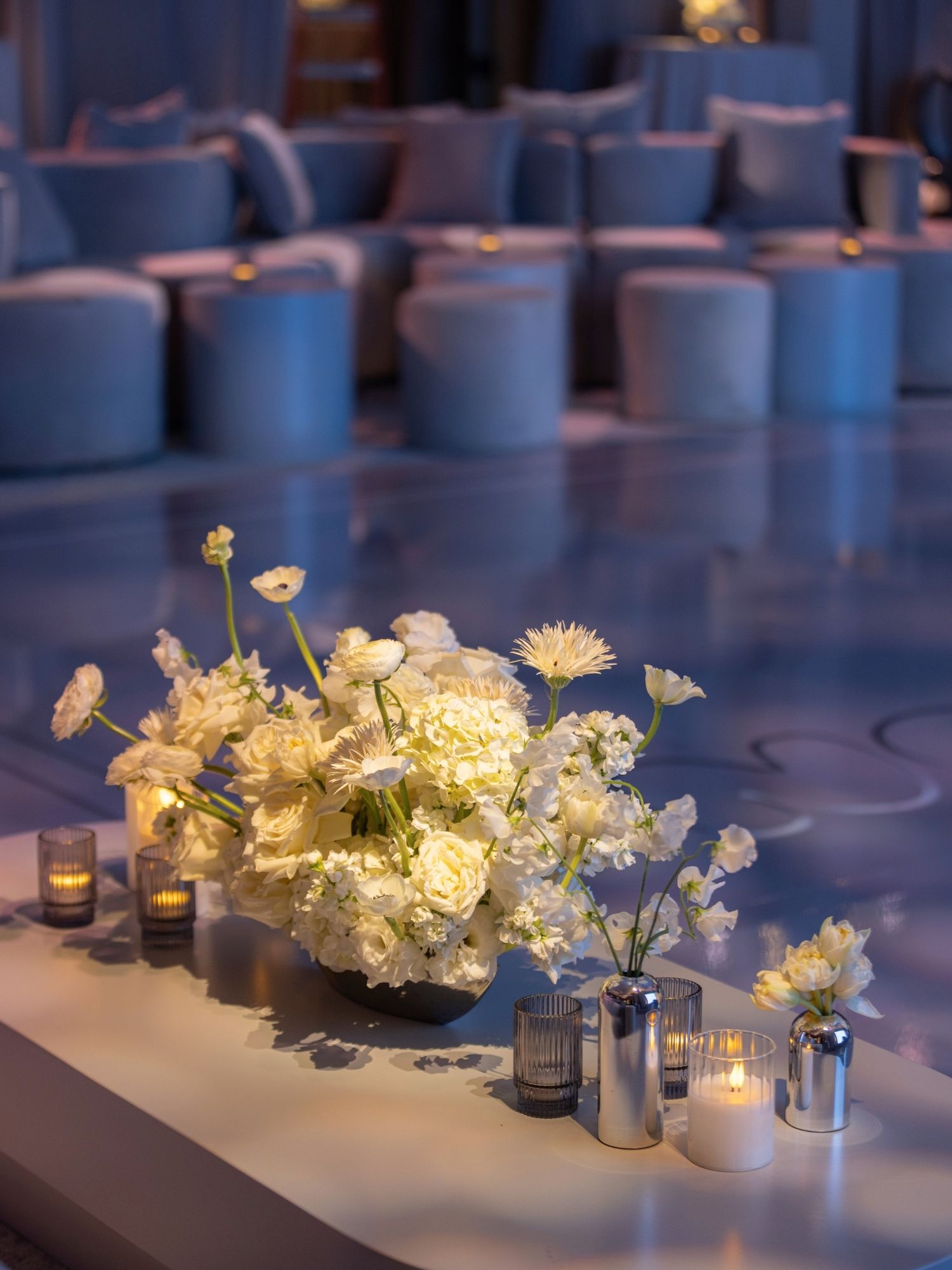 By layering textures, lighting, and monochromatic tones, we created a sophisticated and memorable celebration in Beverly Hills.