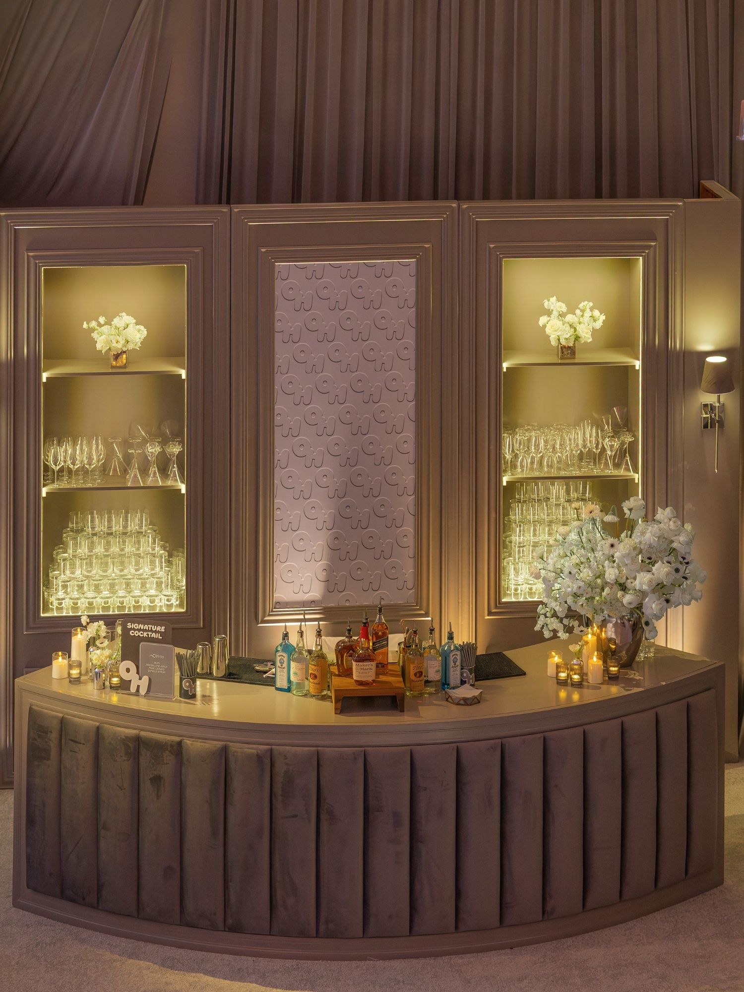The custom bar design served as a focal point of this modern Mitzvah. Our New York bar was wrapped in custom gray velvet fabric, paired with our Tiffany wood panels, and finished with a custom print between the shelves. To enhance the atmosphere, we added sconces on each side of the bar. We also incorporated a custom “OH” vinyl print, branding the space with the siblings’ initials and tying the design into the overall event theme.