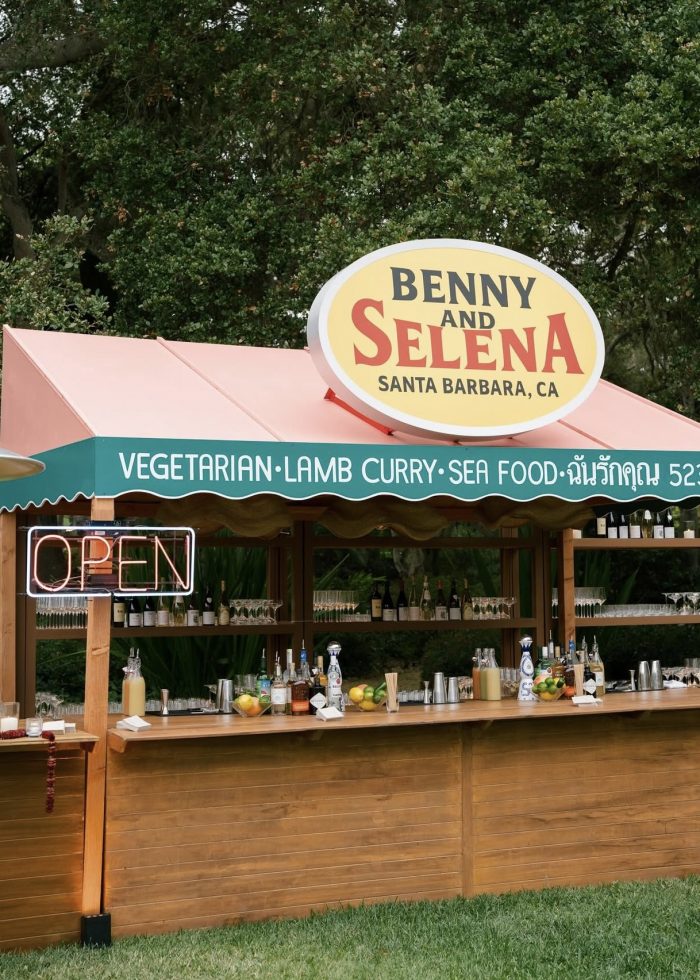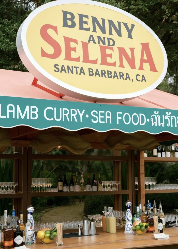 The couple’s love story was thoughtfully woven into the wedding weekend, beginning with their welcome dinner. Selena Gomez and Benny Blanco shared their first date at Jitlada, the beloved Thai restaurant on Sunset Boulevard in Los Angeles, California. For the welcome dinner, the couple served Jitlada’s iconic Thai cuisine to guests as a meaningful nod to where their relationship began. To enhance the experience, we designed a custom display structure over our Bali Bar, complete with barbacks and a fully built framework. We carefully color-matched Jitlada’s original façade to create a seamless and authentic visual connection. The installation also incorporated the restaurant’s iconic signage. Upon closer inspection, the signage revealed a hidden Easter egg — “I love you” written in Thai — a subtle, intimate detail designed for those who noticed the finer moments.