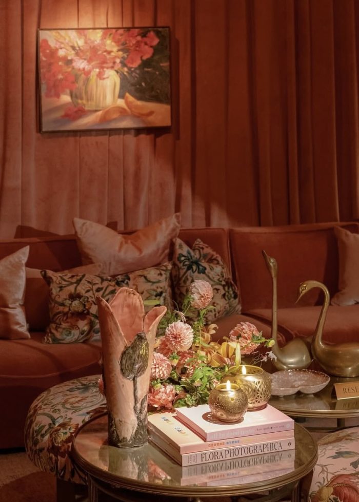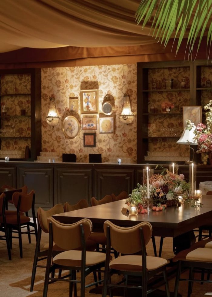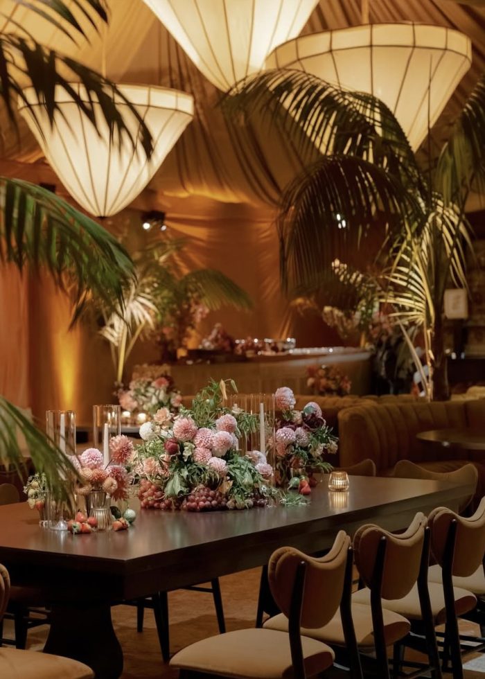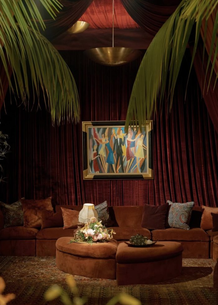 For the wedding reception and after-party, we curated and styled the space with custom bar elements, gold plate pendants, DJ booths, round booths adorned with floral covers, and a thoughtfully selected collection of luxury lounge furnishings, including our signature Oval Metal Cart used as décor. Each piece was intentionally chosen to create an unforgettable guest experience. The overall design embraced warm, earthy tones layered with copper accents and rich velvet textures. Palm trees surrounded the décor, while gold pendants and chandeliers provided soft, ambient lighting that created an intimate and elevated atmosphere throughout the evening.